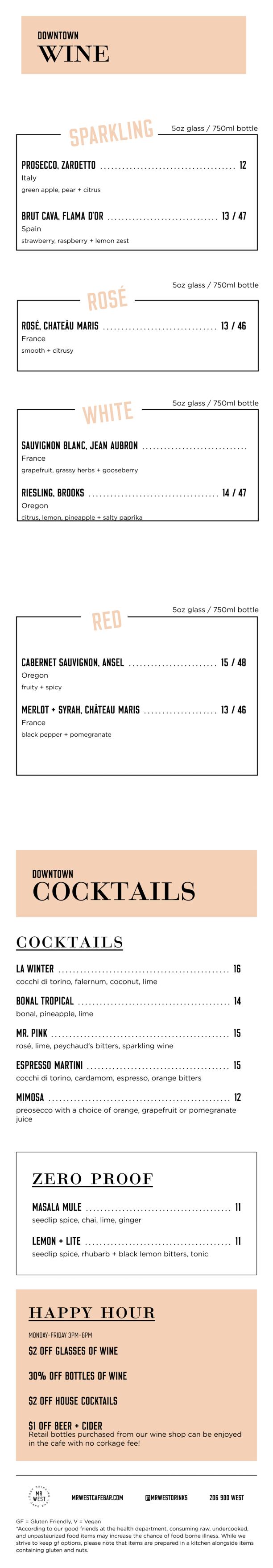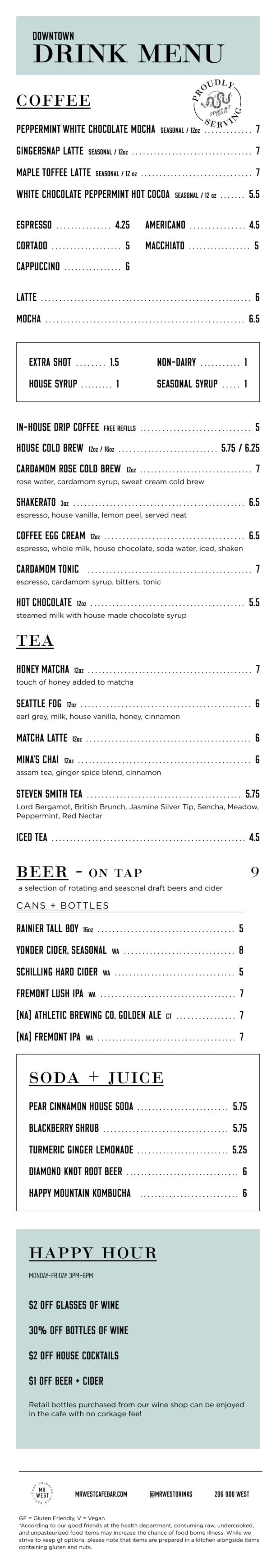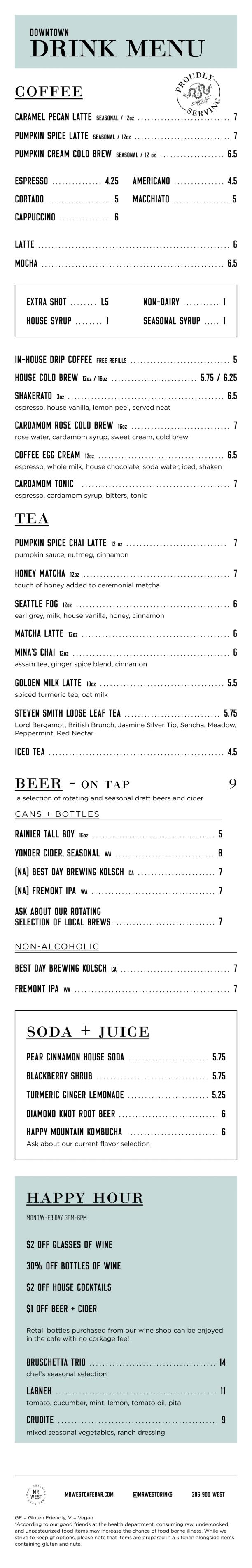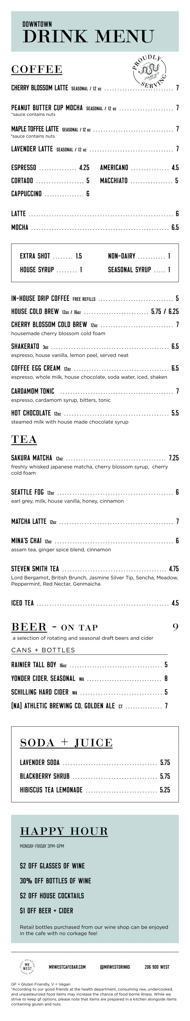Mon-Fri :: 7am-7pmSat + Sun :: 8am-7pmHappy Hour :: M-F 3-6pm